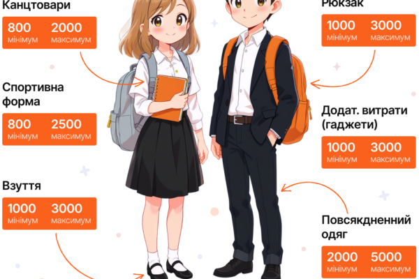 – Канцтовари: 800–2000 грн. До базового набору входять зошити, обкладинки, папки, пенал, ручки, олівці, гумки, точилки, лінійки, фарби, альбом для малювання тощо.