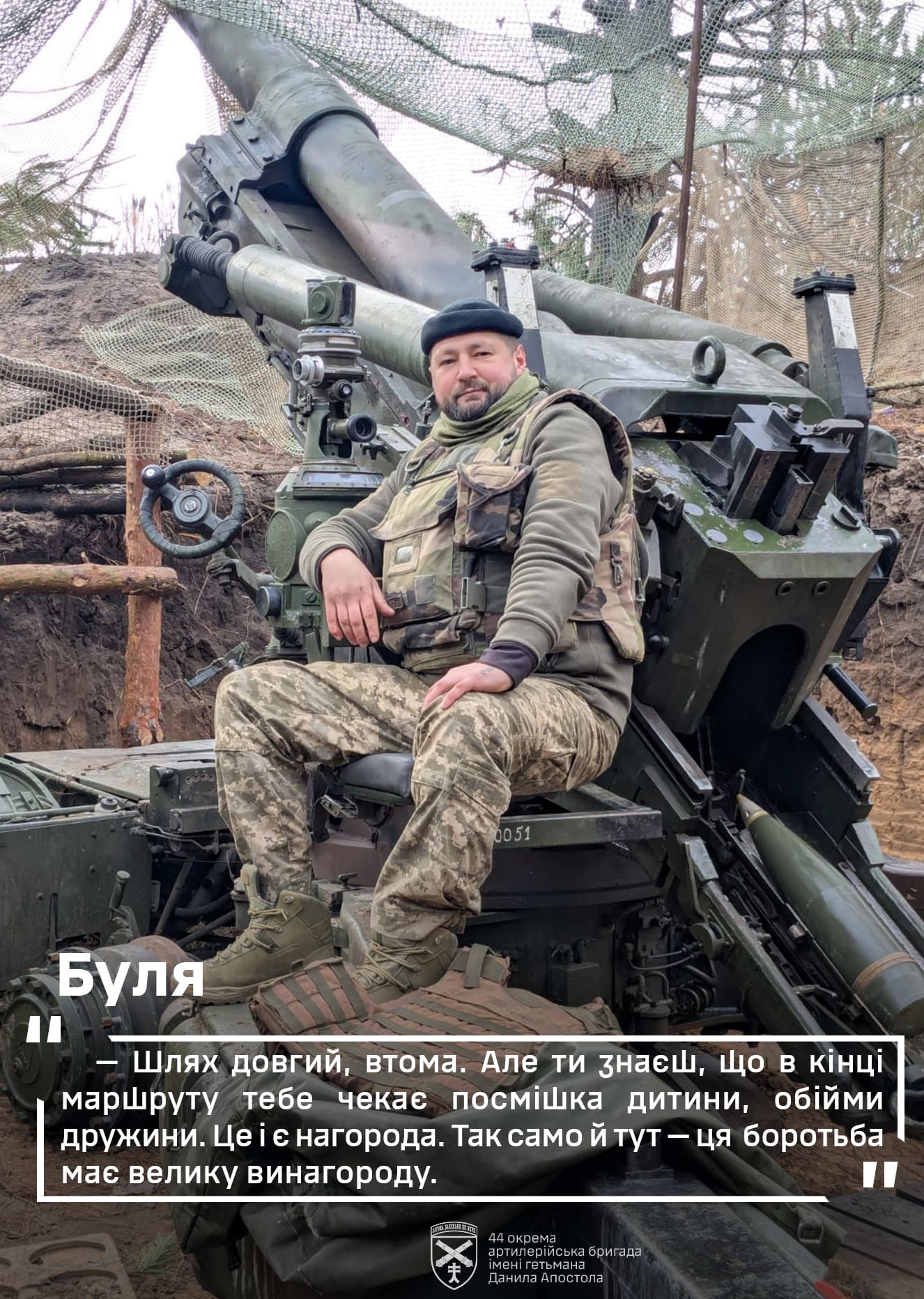 Як повідомили у з’єднанні, вперше він пішов на фронт ще в 2014 році. Відслужив рік і повернувся. Та після повномасштабного рашистського вторгнення все було інакше. Його направили на полігон: курси протитанкістів. Потім – 44 Окрема артилерійська бригада імені гетьмана Данила Апостола Оперативного командування “Захід” Сухопутних військ Збройних Сил України. Спершу батальйон охорони, згодом перевели в бойовий підрозділ. Звична роль водія. Але тепер “Буля” ще й резервний навідник САУ.