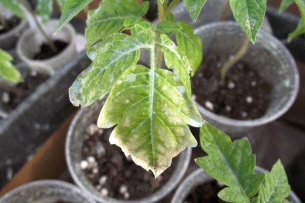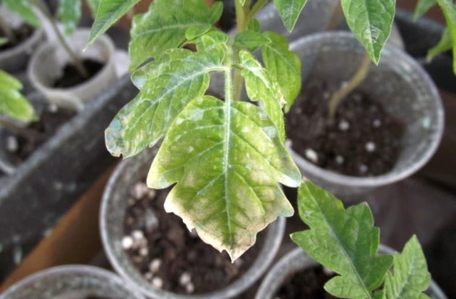 Пожовтіння міжжилкових ділянок свідчить про нестачу магнію, тому слід провести підживлення томатів цим елементом у хелатній формі.