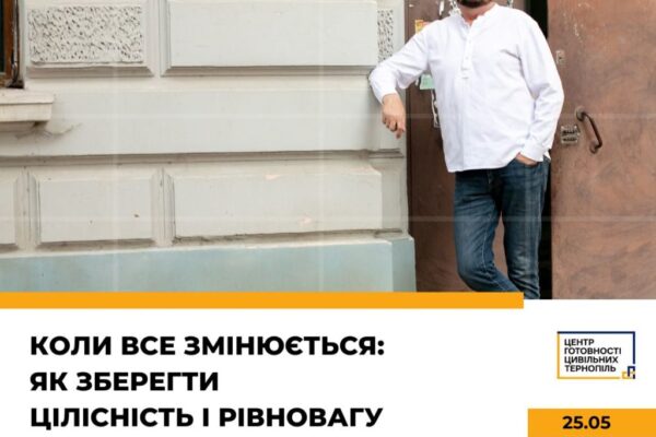 25 травня о 14:00 відбудеться тренінг «Коли все змінюється: як зберегти цілісність і рівновагу» від Центру готовності цивільних. Захід триватиме 2 години, його проведе психолог Петро Воробець.