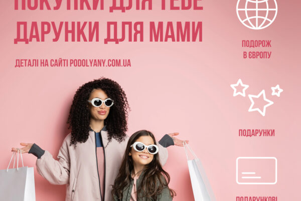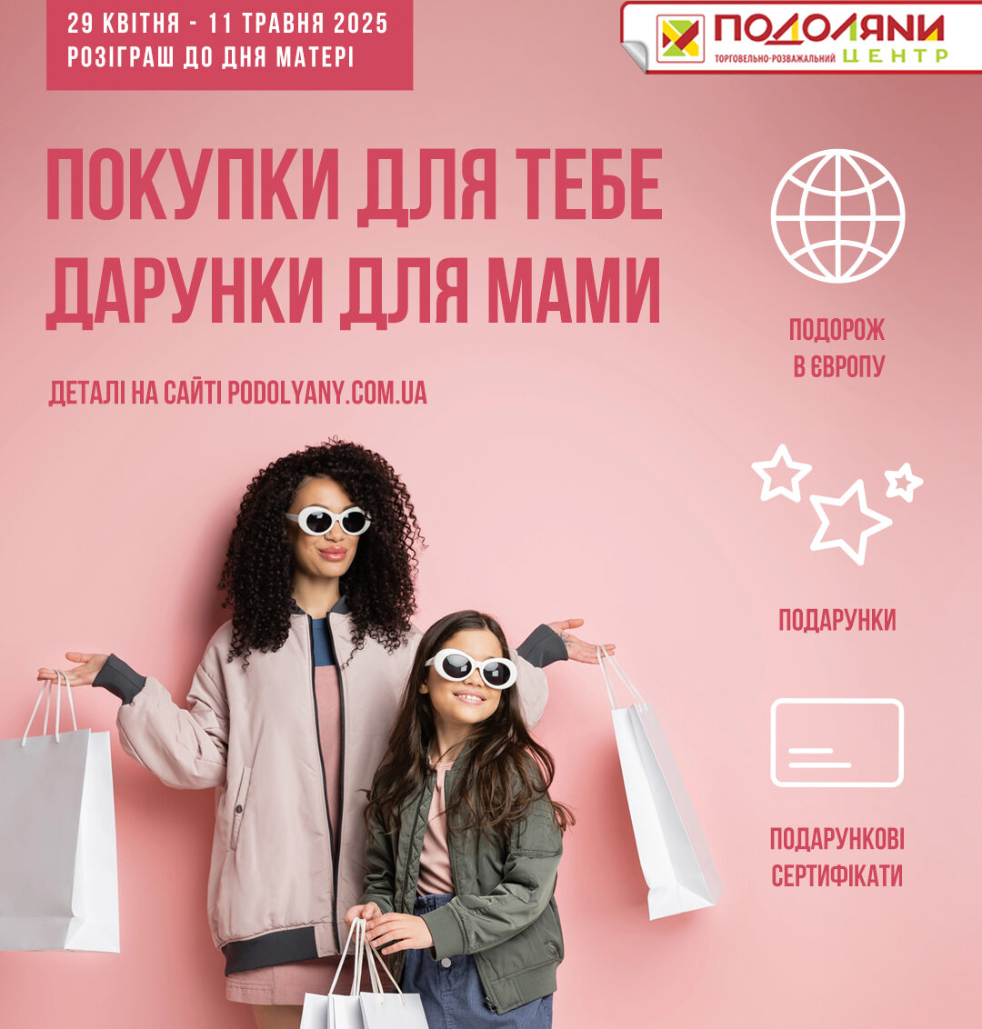 ТРЦ «Подоляни» запрошує тернополян взяти участь в акції до Дня Матері «Покупки для тебе, дарунки для мами» — і отримати шанс виграти цінні подарунки, серед яких подорож у Європу, сертифікати на тайський масаж та приємні сюрпризи для найрідніших.
