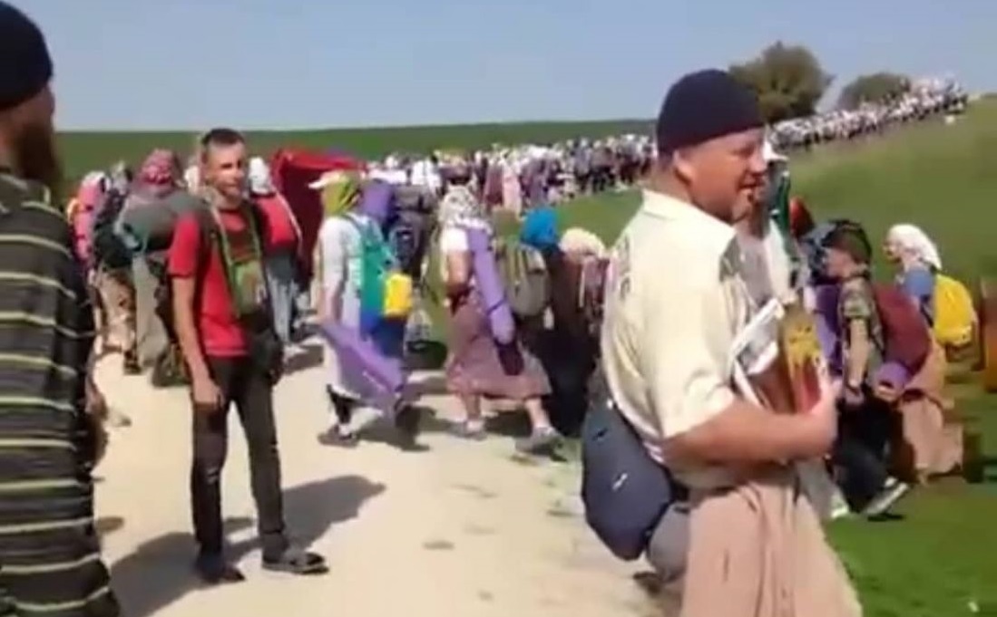 У колоні видно здорових молодих чоловіків, жінок з маленькими дітьми, яких везуть у колясках у 30-градусну спеку, закутаними у хустки, та старців, а також священників мп.