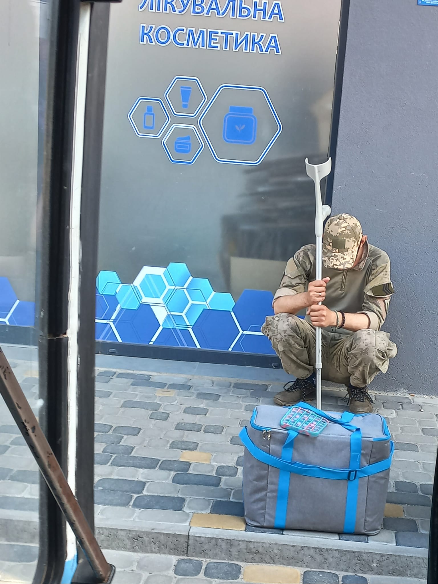 Воїн попри біль змушений був очікувати транспорт опираючись на милиці, оскільки сидячого місця на зупинці для людей не передбачено.