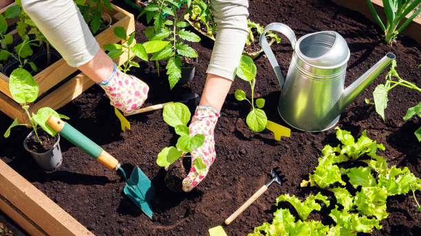 A farmer planting eggplant seedlings in black soil in raised beds. The process of planting plants in the beds. The gardener's hands are transplanting a sprout from a pot into the ground with a shovel.