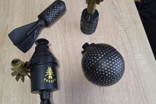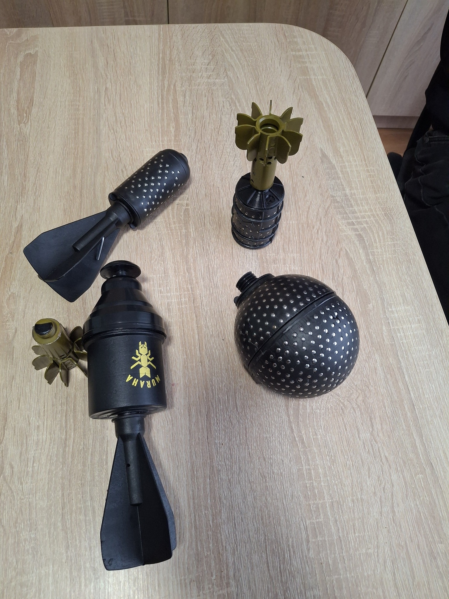 Серед переданих експонатів — елементи різної форми та конструкції, зокрема подовжені та округлі деталі з хвостовими стабілізаторами, а також корпуси з характерною текстурою та металевими елементами.