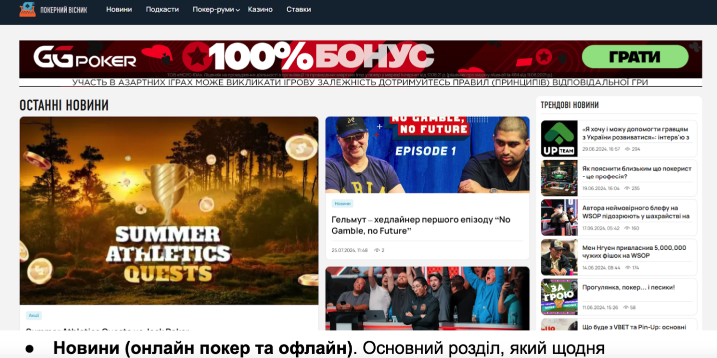 Завдяки розмаїттю розділів, навчальних матеріалів, новин та оглядів, сайт стає комплексним гідом у світі покеру, забезпечуючи гравців усім необхідним для успішної та безпечної гри.