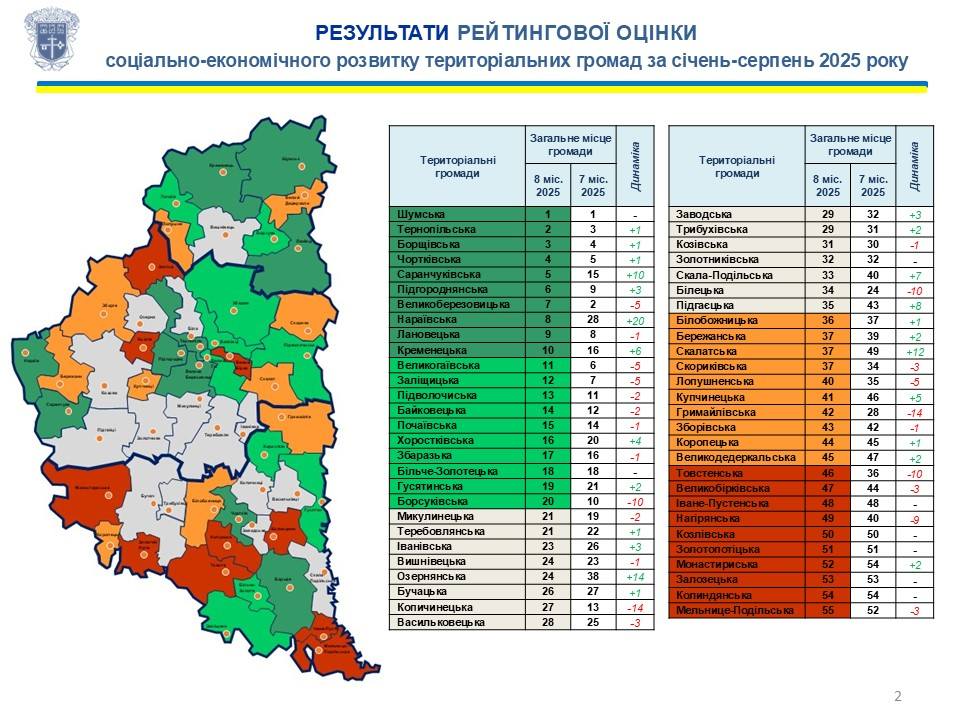 Водночас окремі громади зазнали зниження. Копичинецька та Гримайлівська втратили по 14 позицій, а Борсуківська, Білецька й Товстенська – по 10.