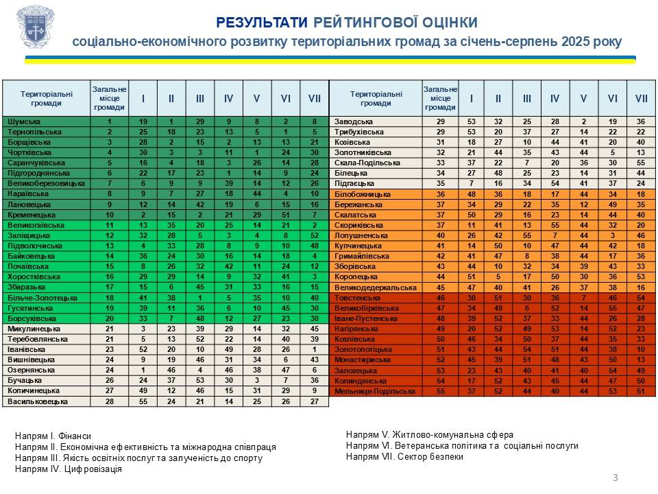 Тернопільська область підбила підсумки соціально-економічного розвитку своїх громад за перші вісім місяців 2025 року. Рейтинг, оприлюднений обласною військовою адміністрацією, охопив 55 громад, оцінюючи їх за 37 показниками у семи ключових сферах: фінанси, економіка та міжнародна співпраця, освіта і спорт, цифровізація, житлово-комунальне господарство, ветеранська політика та соціальні послуги, а також сектор безпеки. Мета – не просто назвати переможців чи аутсайдерів, а дати громадам чітке розуміння їхніх сильних і слабких сторін, щоб спрямовувати ресурси туди, де вони потрібні найбільше.
