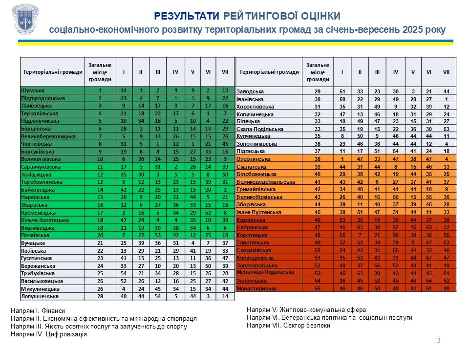 Підбили підсумки рейтингів спроможності територіальних громад Тернопільської області за період січень–вересень 2025 року. За результатами оцінки, оприлюдненими сьогодні, лідером за показниками соціально-економічного розвитку стала Шумська громада, випередивши конкурентів завдяки стабільним досягненням у фінансах, освіті та безпеці. Цей рейтинг, складений на основі ключових індикаторів, таких як освіта, ЖКГ, цифровізація та фінансова стійкість, демонструє як успіхи, так і виклики для громад регіону.