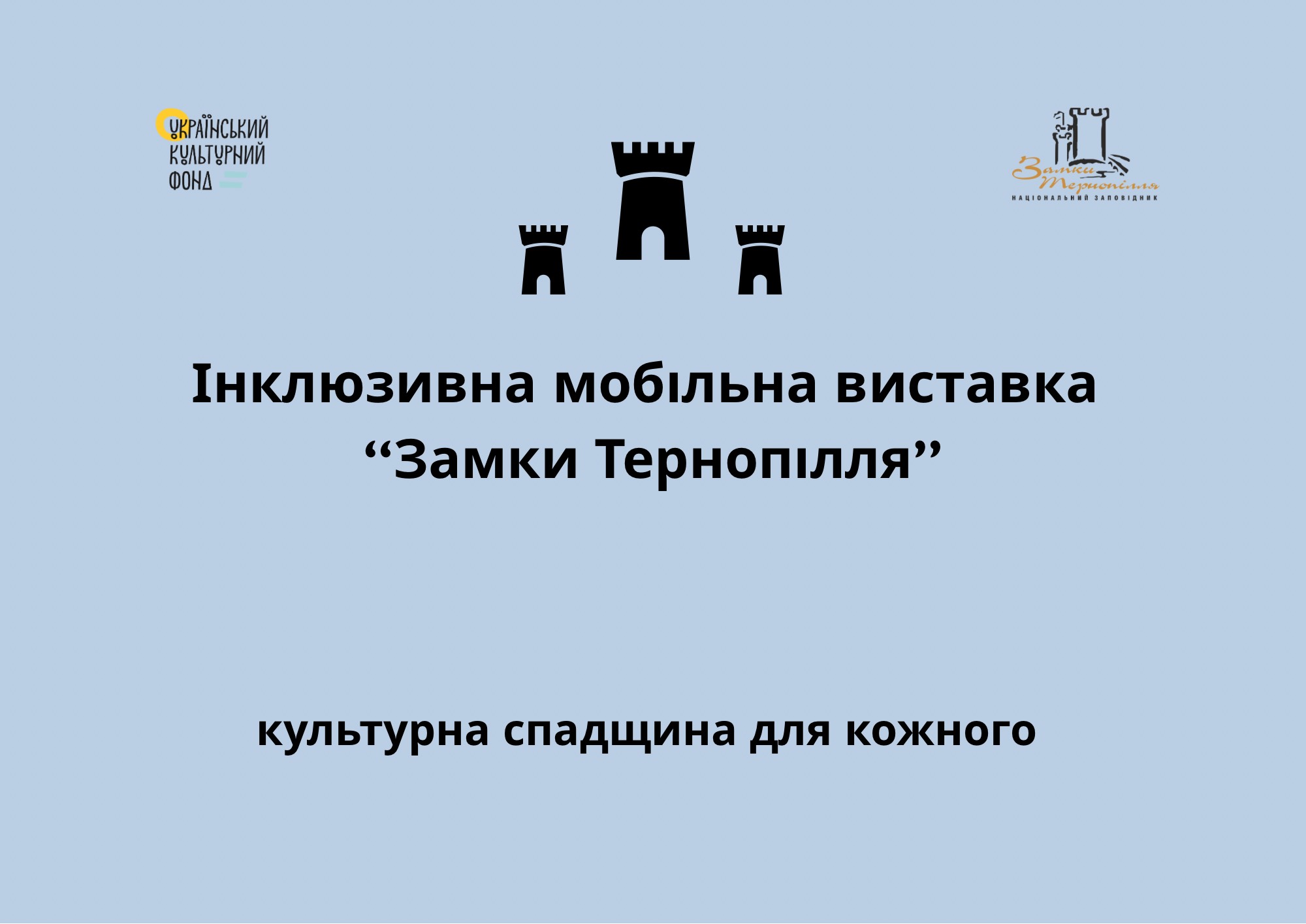 Проєкт передбачає створення інклюзивної мобільної виставки, яка включатиме макети 11 пам’яток культурної спадщини Тернопільської області. Виставку доповнить інклюзивно доступний контент – звукоописи памʼяток для осіб з порушеннями зору, відеоролики про памʼятки з титруванням та жестовою мовою для людей з порушеннями слуху та книга про замки написана простою мовою для людей з ментальними порушеннями.