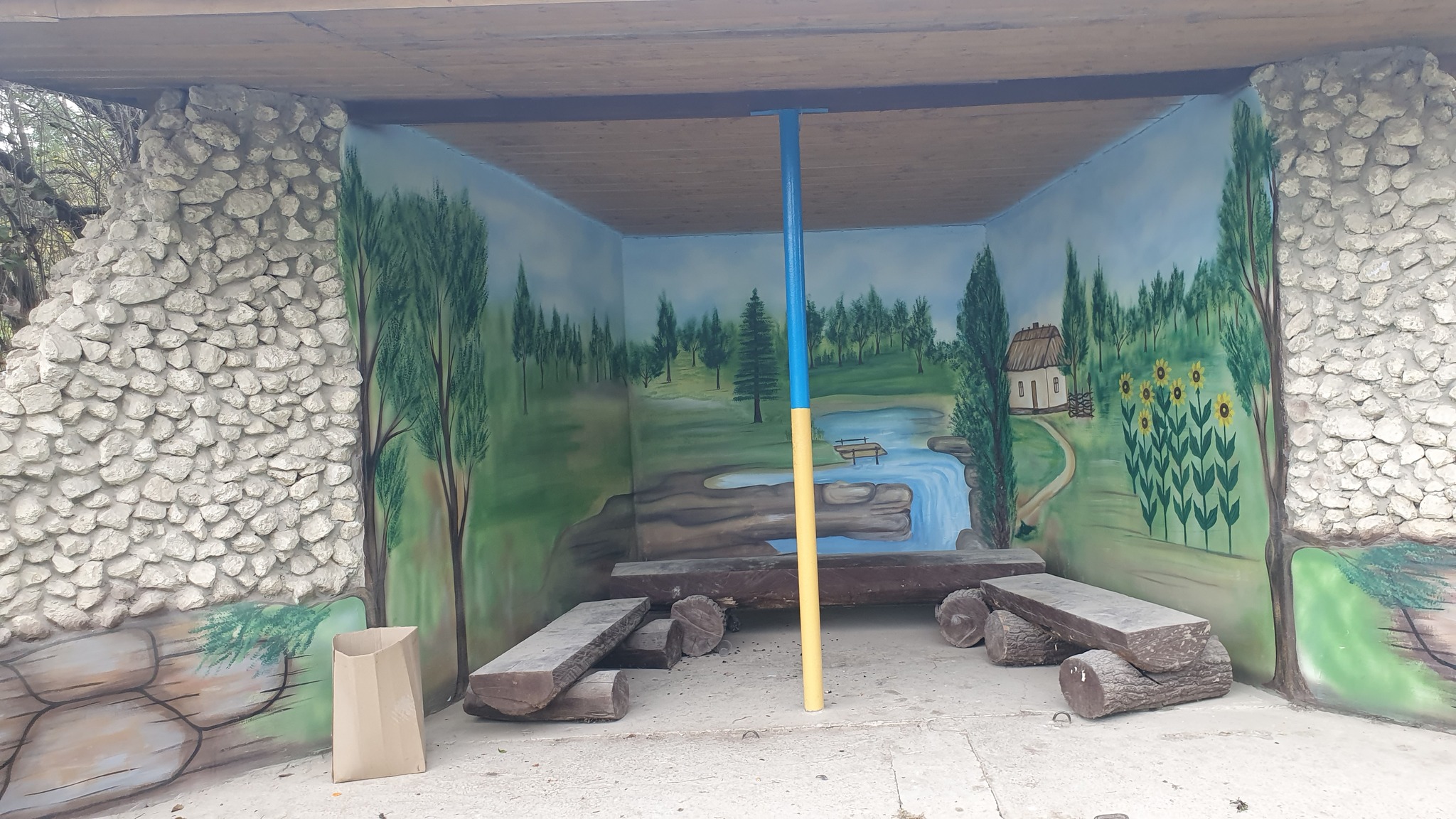 Робота юної художниці стала окрасою села. На стінах зупинки ожили мальовничі пейзажі, які передають красу природи рідного краю.