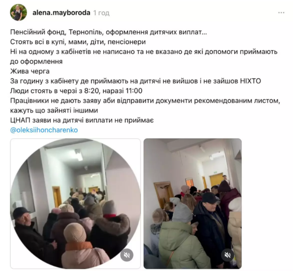 За словами авторки допису, протягом години черга в кабінеті, де приймали заяви на дитячі виплати, не просунулася ні на одну людину.