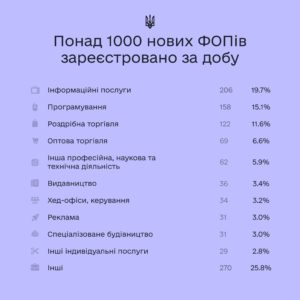 Таку кількість нових бізнесів відкрили українці за першу добу з відновлення автоматичної реєстрації ФОП у Дії. Серед лідерів відкритих ФОП — сфери надання інформаційних послуг, ІТ та роздрібна торгівля, дослідили в opendatabot.